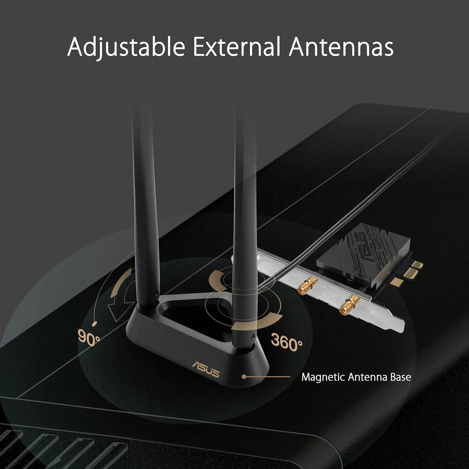 WiFi 7 PCI-E Adapter with 2 external antennas and magnetized base, supporting 6GHz band, 320MHz, Bluetooth 5.4, WPA3 network security, only compatible with lntel motherboards