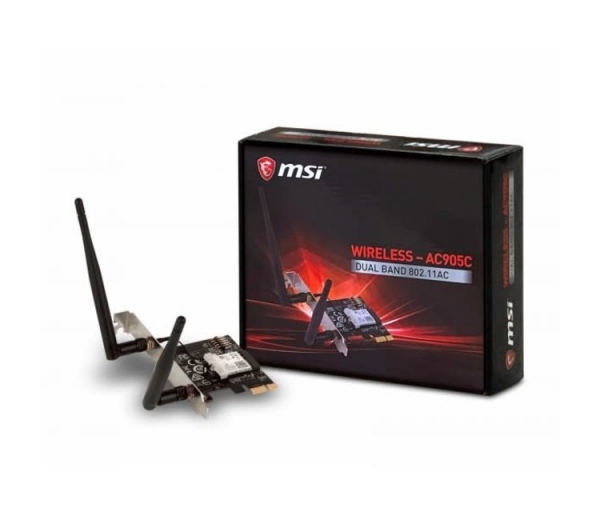 Compatible with systems running Windows 10 / 8.1, the Dual Band 802.11ac Wireless PCIe Adapter Card from MSI supports the Intel® 8265 chipset which includes 802.11a/b/g/n/ac and Bluetooth 4.2 network standards, operating frequencies of 2.4 and 5 GHz, and a bandwidth of up to 867 Mbps. This card requires a PCIe x1 slot and also supports Intel® Wireless Display (WiDi) and Intel® Smart Connect Technology. Included are two antennas and a USB cable that supports the USB 2.0 pin header.