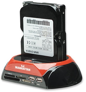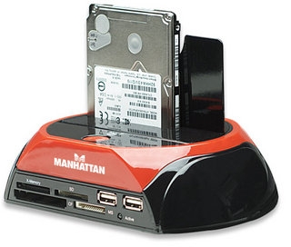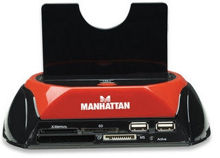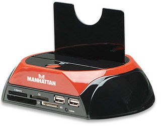 Enjoy fast data access, create portable storage and simplify HDD exchanges.Ideal for IT technicians and desktop or notebook computer owners with numerous hard-disk drives, the MANHATTAN Multi-Function SATA Quick Dock eliminates the need for multiple external enclosures and inconvenient PC case installation and removal. Its One Touch Backup and high-capacity hard-drive support (up to 1 TB and more) make data transfer tasks simple and easy to complete. Compact size with heavy-duty construction and rubber underside mounts help isolate and reduce vibration to keep the MANHATTAN Multi-function SATA Quick Dock and an installed drive securely in place on a desk or technician's bench. The multi-card reader panel allows digital media enthusiasts to easily download and transfer digital images across many of today’s popular flash memory card formats (some require an adapter not included). Compatible with CompactFlash, Microdrive, Memory Stick, MagicGate, SecureDigital, Multimedia and XD formats, files are easily accessed without directly connecting the camera or other media device to the computer. Plug and Play with Windows compatibility, the MANHATTAN Multi-Function SATA Quick Dock quickly installs through an available USB or eSATA port. Its hot-swap capability allows rapid, multi-HDD exchanges and quick data access without computer restarts.
